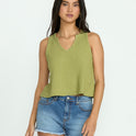 Our Aya Sun Knit Tank in a soft, relaxed poly-cotton slub knit blend. Slouchy fit with stylish notched neckline and branded metal logo plate.