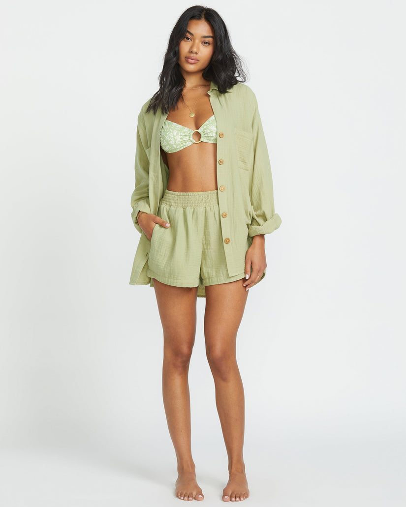 Breezy 100% cotton double gauze shirt with laid-back, oversized fit. Long sleeves, button-down closure, patch pockets, and metal plate. Featured here in the Avocado colorway.